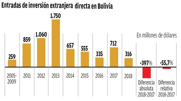 Y si se ven que la cosa no tiene solución -como lamentablemente sucede en nuestros países- mueven sus patrimonios a países más decentes y que les brinden más seguridad jurídica de largo plazo, Andorra, por ejemplo. En esos caso, perdemos todos porque nos quedamos sin potenciales inversores y con mala fama en el contexto internacional. En el cuadro de abajo podemos ver que la inversión extranjera en Bolivia fue descendiendo desde el 2013 -año que nos vendieron el cuento del milagro boliviano-.