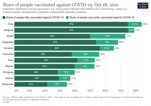 Empero, los problemas no terminan en lo económico. Ya que la gestión de la pandemia y la vacunación caen en lo pésimo ―sólo Venezuela está peor que el país― como se puede apreciar en el siguiente gráfico.